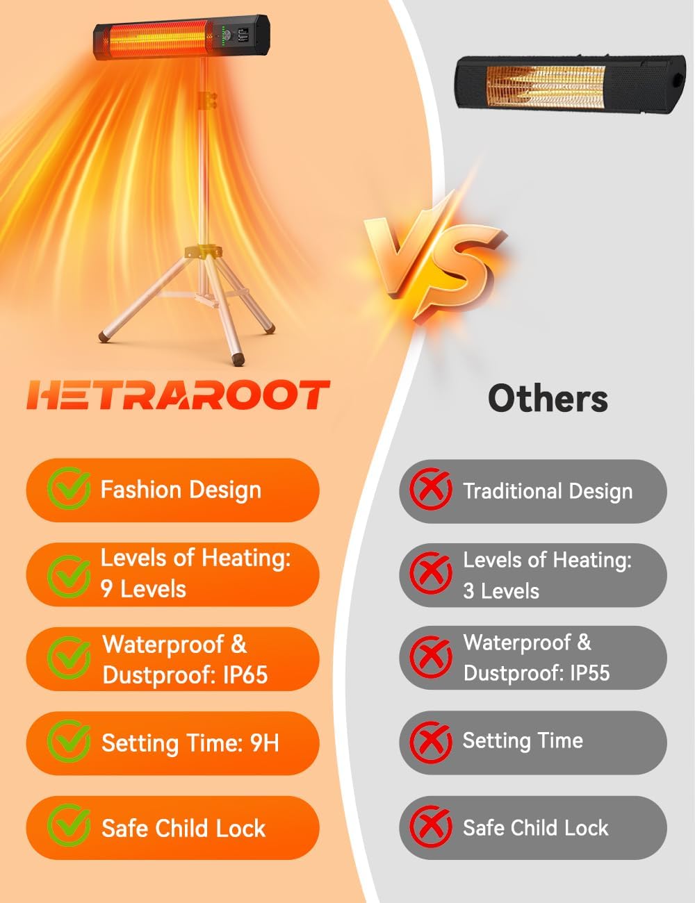 - 【🔥 1-Min Quick Assembly, Easy Moving】The HETRAROOT outdoor electric heater features a user-friendly design and a quick-release tripod, allowing for easy installation in just 1 minute, without the need for complex tools. This portable heater outdoor features a lightweight, sturdy tripod design for easy mobility. Whether you need heating on your patio, patio, or indoors in your bedroom or living room, it provides a comfortable solution.